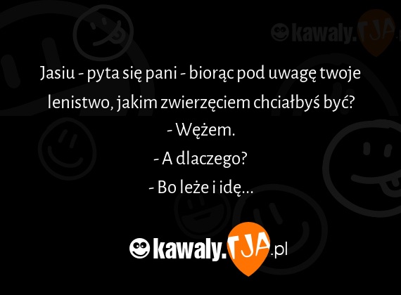 Jasiu - pyta się pani - biorąc pod uwagę twoje lenistwo, jakim zwierzęciem chciałbyś być? - Wężem. - A dlaczego? - Bo leże i idę...