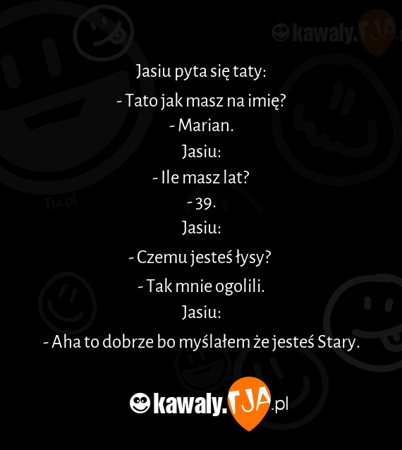 Jasiu pyta się taty: - Tato jak masz na imię? - Marian. Jasiu: - Ile masz lat? - 39. Jasiu: - Czemu jesteś łysy? - Tak mnie ogolili. Jasiu: - Aha to dobrze bo myślałem że jesteś Stary.