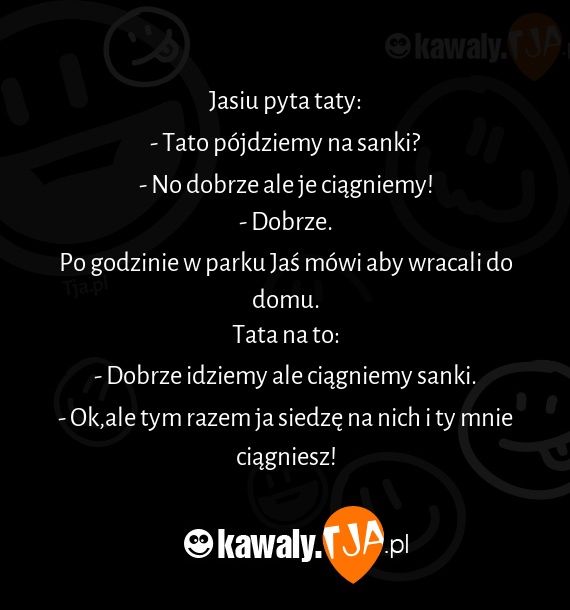 Jasiu pyta taty: - Tato pojdziemy na sanki? - No dobrze ale je ciagniemy! - Dobrze. Po godzinie w parku Jas mowi aby wracali do domu. Tata na to: - Dobrze idziemy ale ciagniemy sanki. - Ok,ale tym razem ja siedze na nich i ty mnie ciagniesz!