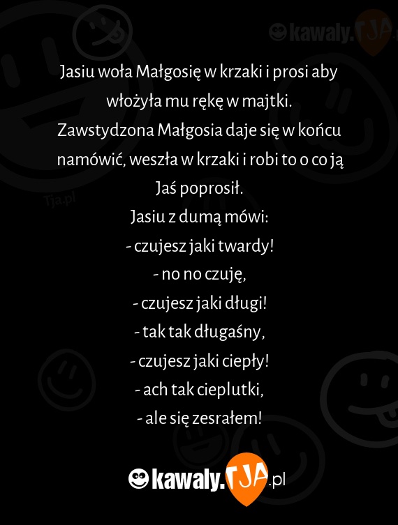 Jasiu woła Małgosię w krzaki i prosi aby włożyła mu rękę w majtki.