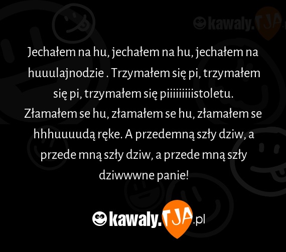 Jechałem na hu, jechałem na hu, jechałem na huuulajnodzie . Trzymałem się pi, trzymałem się pi, trzymałem się piiiiiiiiistoletu. Złamałem se hu, złamałem se hu, złamałem se hhhuuuudą ręke. A przedemną szły dziw, a przede mną szły dziw, a przede mną szły dziwwwne panie!