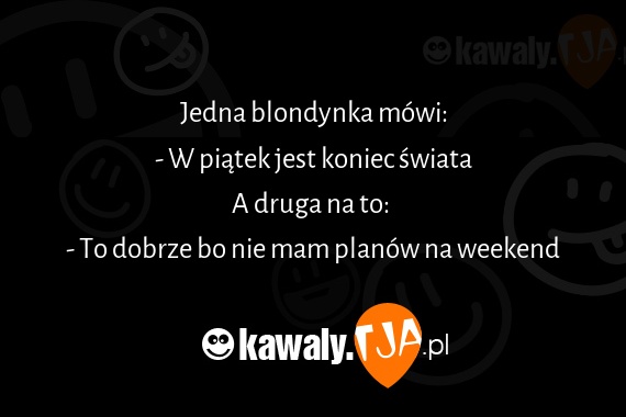 Jedna blondynka mowi: - W piatek jest koniec swiata A druga na to: - To dobrze bo nie mam planow na weekend