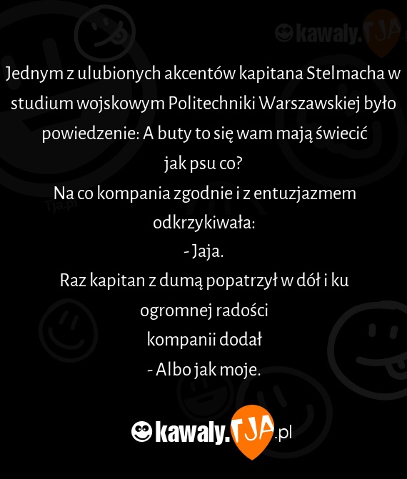 Jednym z ulubionych akcentów kapitana Stelmacha w studium wojskowym Politechniki Warszawskiej było powiedzenie: A buty to się wam mają świecić jak psu co?