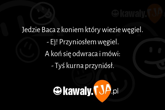 Jedzie Baca z koniem który wiezie węgiel. - Ej! Przyniosłem węgiel. A koń się odwraca i mówi: - Tyś kurna przyniósł.