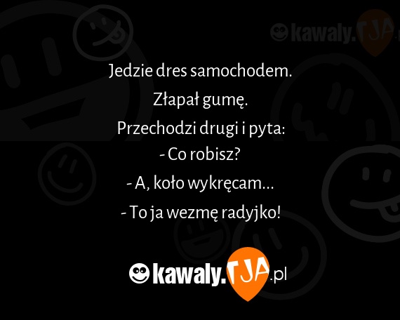 Jedzie dres samochodem. Zlapal gume. Przechodzi drugi i pyta: - Co robisz? - A, kolo wykrecam... - To ja wezme radyjko!