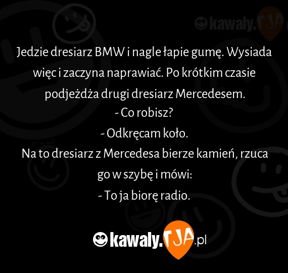 Jedzie dresiarz BMW i nagle łapie gumę. Wysiada więc i zaczyna naprawiać. Po krótkim czasie podjeżdża drugi dresiarz Mercedesem. - Co robisz? - Odkręcam koło. Na to dresiarz z Mercedesa bierze kamień, rzuca go w szybę i mówi: - To ja biorę radio.