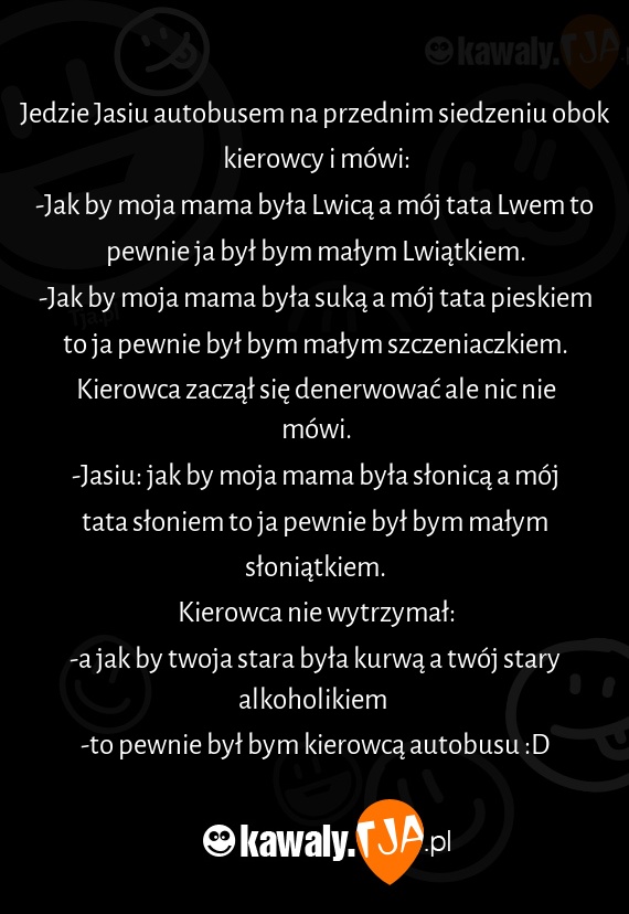 Jedzie Jasiu autobusem na przednim siedzeniu obok kierowcy i mówi: