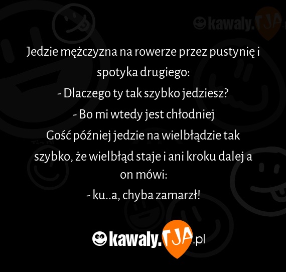 Jedzie mężczyzna na rowerze przez pustynię i spotyka drugiego: - Dlaczego ty tak szybko jedziesz? - Bo mi wtedy jest chłodniej Gość później jedzie na wielbłądzie tak szybko, że wielbłąd staje i ani kroku dalej a on mówi: - ku..a, chyba zamarzł!