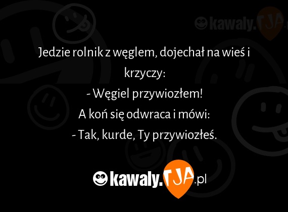 Jedzie rolnik z weglem, dojechal na wies i krzyczy: - Wegiel przywiozlem! A kon sie odwraca i mowi: - Tak, kurde, Ty przywiozles.