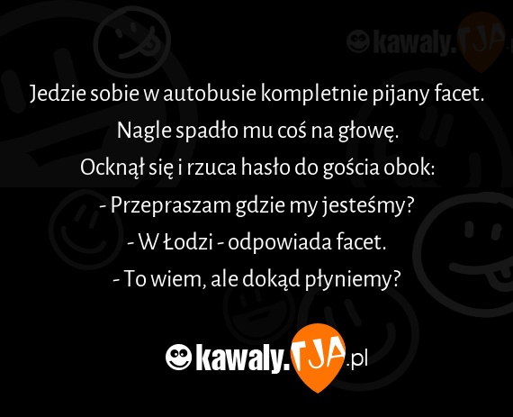 Jedzie sobie w autobusie kompletnie pijany facet. Nagle spadło mu coś na głowę. Ocknął się i rzuca hasło do gościa obok: - Przepraszam gdzie my jesteśmy? - W Łodzi - odpowiada facet. - To wiem, ale dokąd płyniemy?
