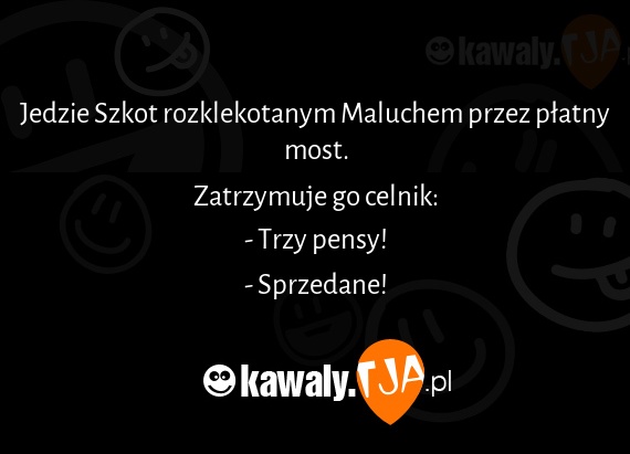 Jedzie Szkot rozklekotanym Maluchem przez platny most. Zatrzymuje go celnik: - Trzy pensy! - Sprzedane!