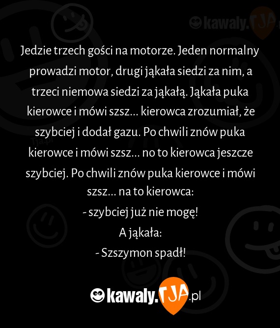 Jedzie trzech gości na motorze. Jeden normalny prowadzi motor, drugi jąkała siedzi za nim, a trzeci niemowa siedzi za jąkałą. Jąkała puka kierowce i mówi szsz... kierowca zrozumiał, że szybciej i dodał gazu. Po chwili znów puka kierowce i mówi szsz... no to kierowca jeszcze szybciej. Po chwili znów puka kierowce i mówi szsz... na to kierowca: