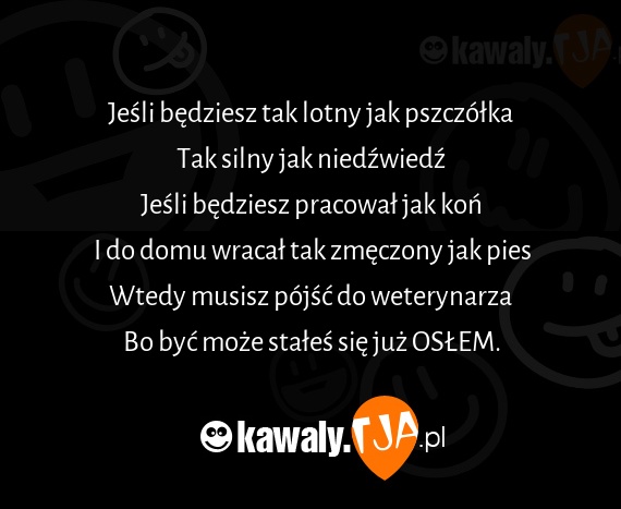 Jeśli będziesz tak lotny jak pszczółka Tak silny jak niedźwiedź Jeśli będziesz pracował jak koń I do domu wracał tak zmęczony jak pies Wtedy musisz pójść do weterynarza Bo być może stałeś się już OSŁEM.