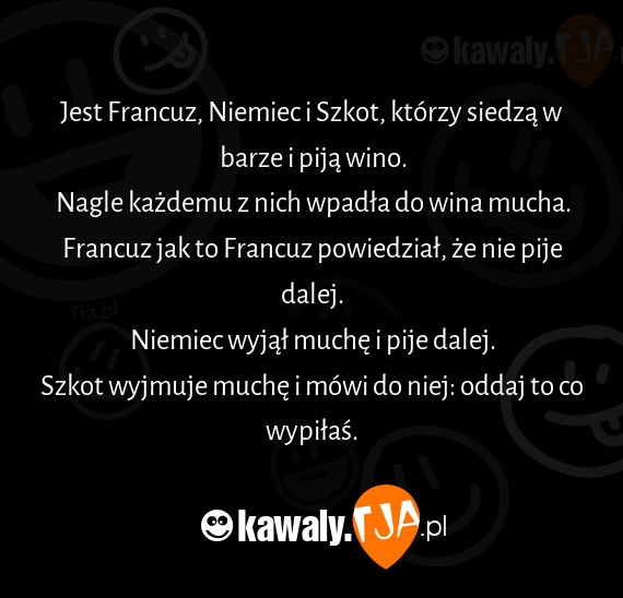 Szkot wyjmuje muchę i mówi do niej: oddaj to co wypiłaś.
