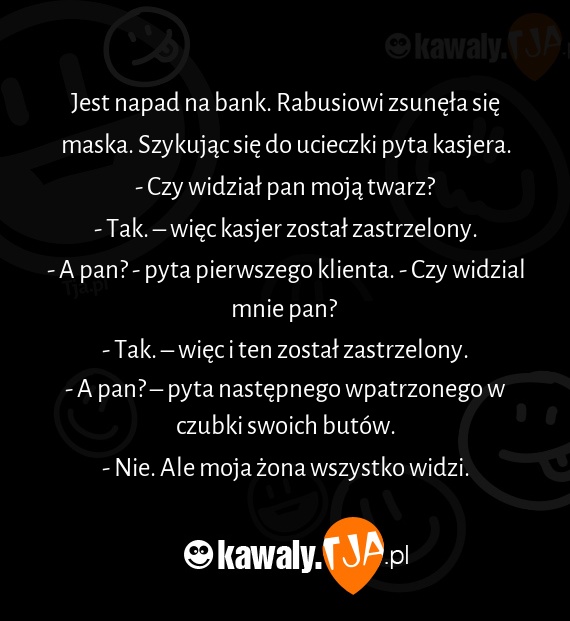 Jest napad na bank. Rabusiowi zsunęła się maska. Szykując się do ucieczki pyta kasjera.