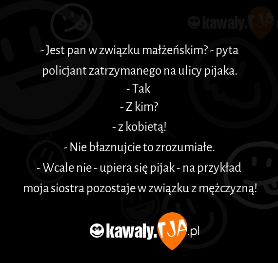 - Wcale nie - upiera się pijak - na przykład moja siostra pozostaje w związku z mężczyzną!