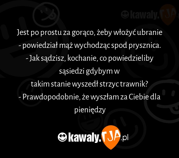 Jest po prostu za gorąco, żeby włożyć ubranie - powiedział mąż wychodząc spod prysznica. - Jak sądzisz, kochanie, co powiedzieliby sąsiedzi gdybym w takim stanie wyszedł strzyc trawnik? - Prawdopodobnie, że wyszłam za Ciebie dla pieniędzy