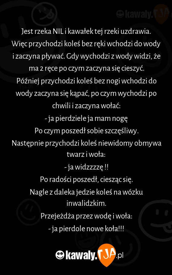 Więc przychodzi koleś bez ręki wchodzi do wody i zaczyna pływać. Gdy wychodzi z wody widzi, że ma 2 ręce po czym zaczyna się cieszyć.