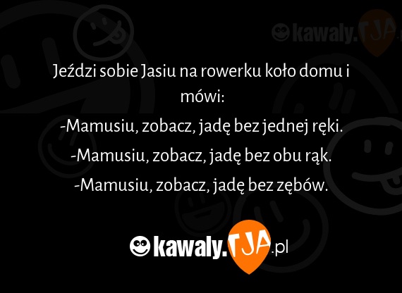 Jexdzi sobie Jasiu na rowerku kolo domu i mowi: -Mamusiu, zobacz, jade bez jednej reki. -Mamusiu, zobacz, jade bez obu rak. -Mamusiu, zobacz, jade bez zebow.