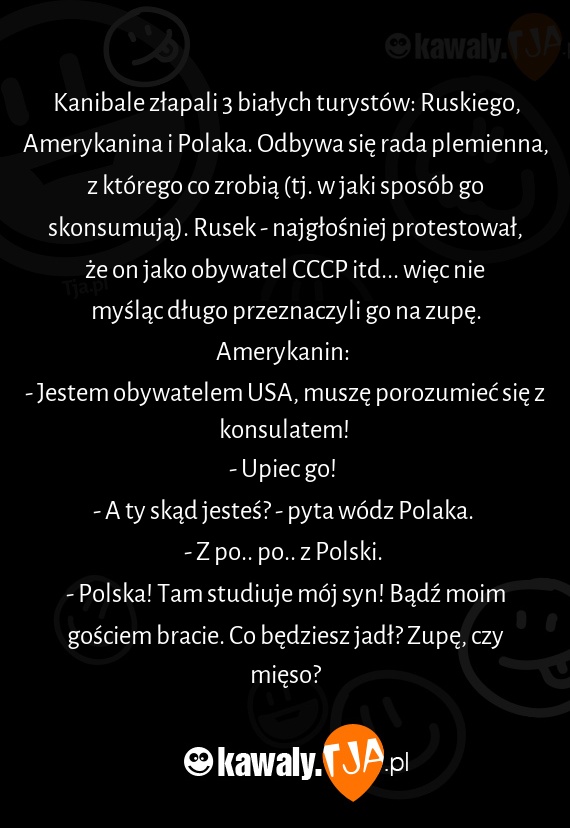 Kanibale złapali 3 białych turystów: Ruskiego, Amerykanina i Polaka. Odbywa się rada plemienna, z którego co zrobią (tj. w jaki sposób go skonsumują). Rusek - najgłośniej protestował, że on jako obywatel CCCP itd... więc nie myśląc długo przeznaczyli go na zupę.