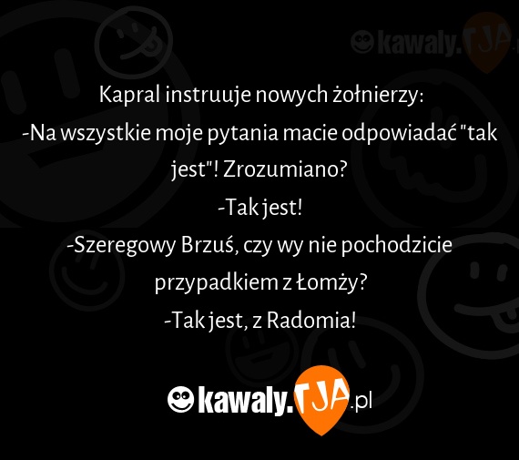 Kapral instruuje nowych zolnierzy: -Na wszystkie moje pytania macie odpowiadac "tak jest"! Zrozumiano? -Tak jest! -Szeregowy Brzus, czy wy nie pochodzicie przypadkiem z Lomzy? -Tak jest, z Radomia!