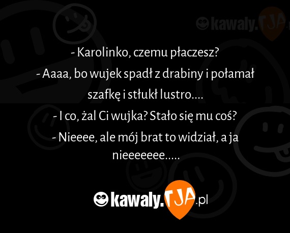 - Karolinko, czemu placzesz? - Aaaa, bo wujek spadl z drabiny i polamal szafke i stlukl lustro.... - I co, zal Ci wujka? Stalo sie mu cos? - Nieeee, ale moj brat to widzial, a ja nieeeeeee.....