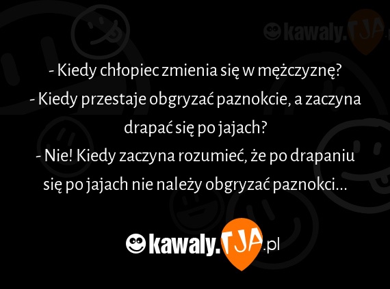 - Kiedy chłopiec zmienia się w mężczyznę? - Kiedy przestaje obgryzać paznokcie, a zaczyna drapać się po jajach? - Nie! Kiedy zaczyna rozumieć, że po drapaniu się po jajach nie należy obgryzać paznokci...