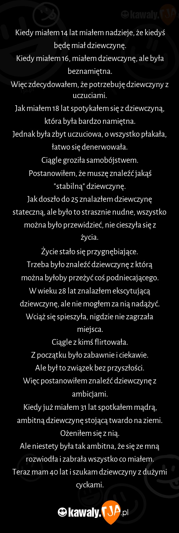 Jak doszło do 25 znalazłem dziewczynę stateczną, ale było to strasznie nudne, wszystko można było przewidzieć, nie cieszyła się z życia.