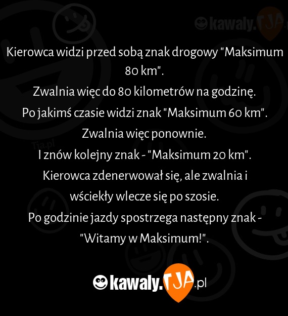 Po godzinie jazdy spostrzega następny znak - "Witamy w Maksimum!".