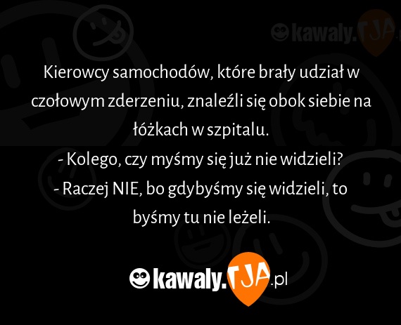 Kierowcy samochodow, ktore braly udzial w czolowym zderzeniu, znalexli sie obok siebie na lozkach w szpitalu. - Kolego, czy mysmy sie juz nie widzieli? - Raczej NIE, bo gdybysmy sie widzieli, to bysmy tu nie lezeli.