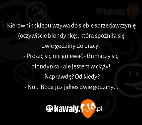 Kierownik sklepu wzywa do siebie sprzedawczynię (oczywiście blondynkę), która spóźniła się dwie godziny do pracy.