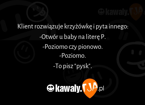 Klient rozwiązuje krzyżówkę i pyta innego: -Otwór u baby na literę P. -Poziomo czy pionowo. -Poziomo. -To pisz "pysk".