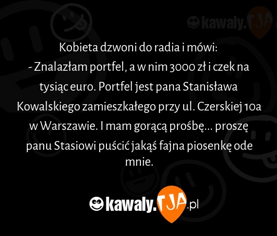 - Znalazłam portfel, a w nim 3000 zł i czek na tysiąc euro. Portfel jest pana Stanisława Kowalskiego zamieszkałego przy ul. Czerskiej 10a w Warszawie. I mam gorącą prośbę... proszę panu Stasiowi puścić jakąś fajna piosenkę ode mnie.