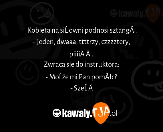 Kobieta na silowni podnosi sztange. - Jeden, dwaaa, ttttrzy, czzzztery, piiiiec.. Zwraca sie do instruktora: - Moze mi Pan pomoc? - Szesc