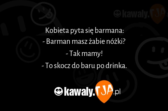 Kobieta pyta sie barmana: - Barman masz zabie nozki? - Tak mamy! - To skocz do baru po drinka.