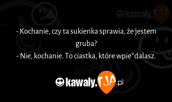 - Kochanie, czy ta sukienka sprawia, że jestem gruba? - Nie, kochanie. To ciastka, które wpie*dalasz.