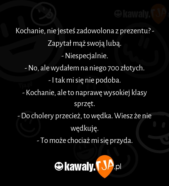 Kochanie, nie jesteś zadowolona z prezentu? - Zapytał mąż swoją lubą.