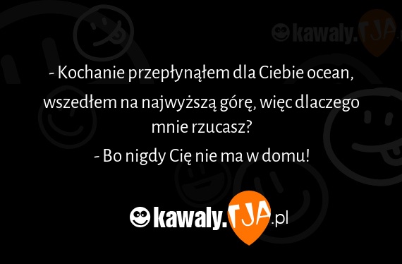 - Kochanie przeplynalem dla Ciebie ocean, wszedlem na najwyzsza gore, wiec dlaczego mnie rzucasz? - Bo nigdy Cie nie ma w domu!