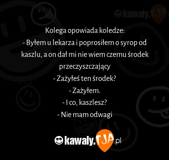 Kolega opowiada koledze: - Byłem u lekarza i poprosiłem o syrop od kaszlu, a on dał mi nie wiem czemu środek przeczyszczający - Zażyłeś ten środek? - Zażyłem. - I co, kaszlesz? - Nie mam odwagi