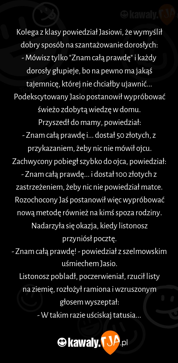 - Mówisz tylko "Znam całą prawdę" i każdy dorosły głupieje, bo na pewno ma jakąś tajemnicę, której nie chciałby ujawnić...
