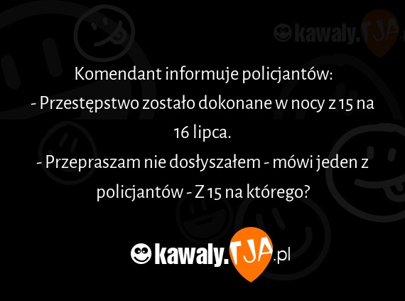 Komendant informuje policjantów: - Przestępstwo zostało dokonane w nocy z 15 na 16 lipca. - Przepraszam nie dosłyszałem - mówi jeden z policjantów - Z 15 na którego?