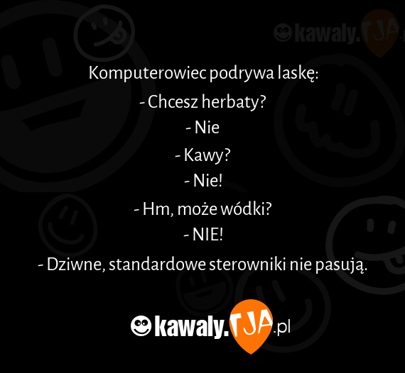 Komputerowiec podrywa laske: - Chcesz herbaty? - Nie - Kawy? - Nie! - Hm, moze wodki? - NIE! - Dziwne, standardowe sterowniki nie pasuja.