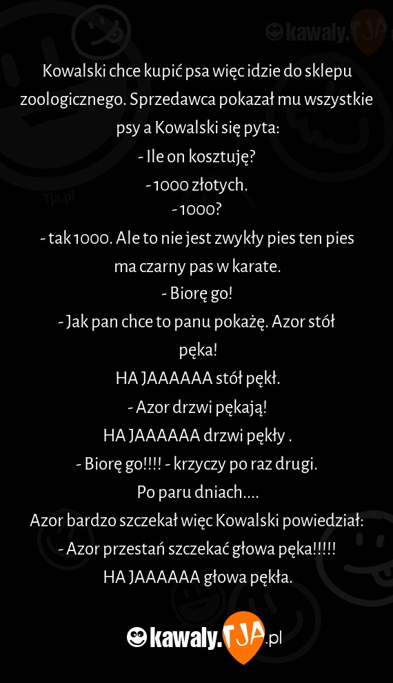 Kowalski chce kupić psa więc idzie do sklepu zoologicznego. Sprzedawca pokazał mu wszystkie psy a Kowalski się pyta: