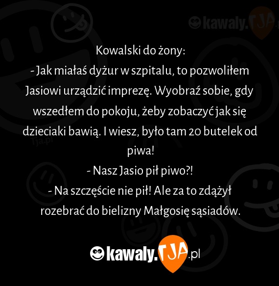 - Jak miałaś dyżur w szpitalu, to pozwoliłem Jasiowi urządzić imprezę. Wyobraź sobie, gdy wszedłem do pokoju, żeby zobaczyć jak się dzieciaki bawią. I wiesz, było tam 20 butelek od piwa!