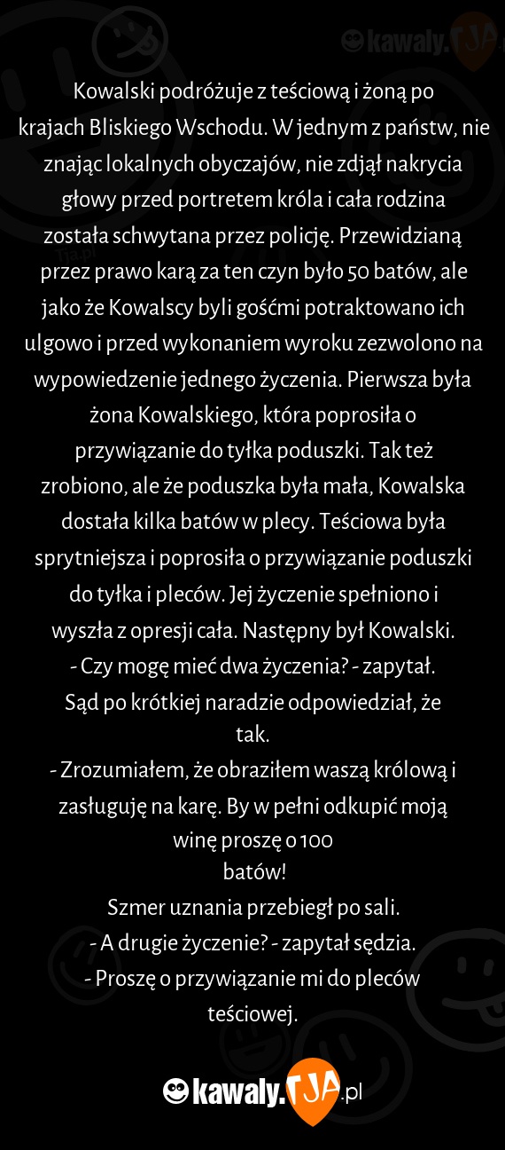 Kowalski podróżuje z teściową i żoną po krajach Bliskiego Wschodu. W jednym z państw, nie znając lokalnych obyczajów, nie zdjął nakrycia głowy przed portretem króla i cała rodzina została schwytana przez policję. Przewidzianą przez prawo karą za ten czyn było 50 batów, ale jako że Kowalscy byli gośćmi potraktowano ich ulgowo i przed wykonaniem wyroku zezwolono na wypowiedzenie jednego życzenia. Pierwsza była żona Kowalskiego, która poprosiła o przywiązanie do tyłka poduszki. Tak też zrobiono, ale że poduszka była mała, Kowalska dostała kilka batów w plecy. Teściowa była sprytniejsza i poprosiła o przywiązanie poduszki do tyłka i pleców. Jej życzenie spełniono i wyszła z opresji cała. Następny był Kowalski.