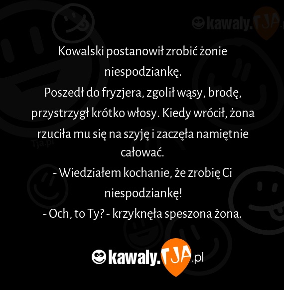 Poszedł do fryzjera, zgolił wąsy, brodę, przystrzygł krótko włosy. Kiedy wrócił, żona rzuciła mu się na szyję i zaczęła namiętnie całować.