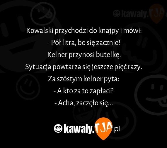 Kowalski przychodzi do knajpy i mówi: - Pół litra, bo się zacznie! Kelner przynosi butelkę. Sytuacja powtarza się jeszcze pięć razy. Za szóstym kelner pyta: - A kto za to zapłaci? - Acha, zaczęło się...