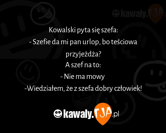 Kowalski pyta sie szefa: - Szefie da mi pan urlop, bo tesciowa przyjezdza? A szef na to: - Nie ma mowy -Wiedzialem, ze z szefa dobry czlowiek!