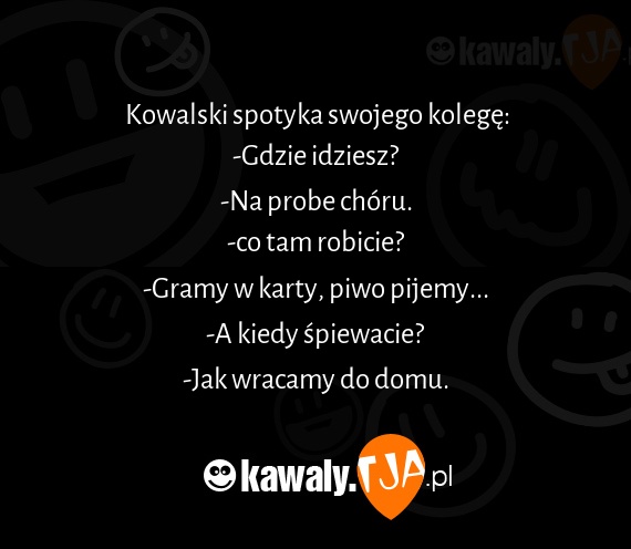 Kowalski spotyka swojego kolegę: -Gdzie idziesz? -Na probe chóru. -co tam robicie? -Gramy w karty, piwo pijemy... -A kiedy śpiewacie? -Jak wracamy do domu.