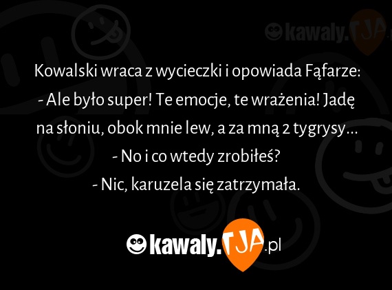 Kowalski wraca z wycieczki i opowiada Fafarze: - Ale bylo super! Te emocje, te wrazenia! Jade na sloniu, obok mnie lew, a za mna 2 tygrysy... - No i co wtedy zrobiles? - Nic, karuzela sie zatrzymala.